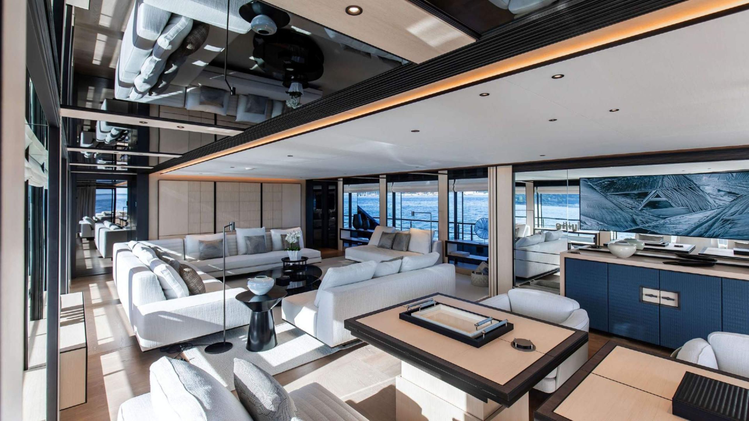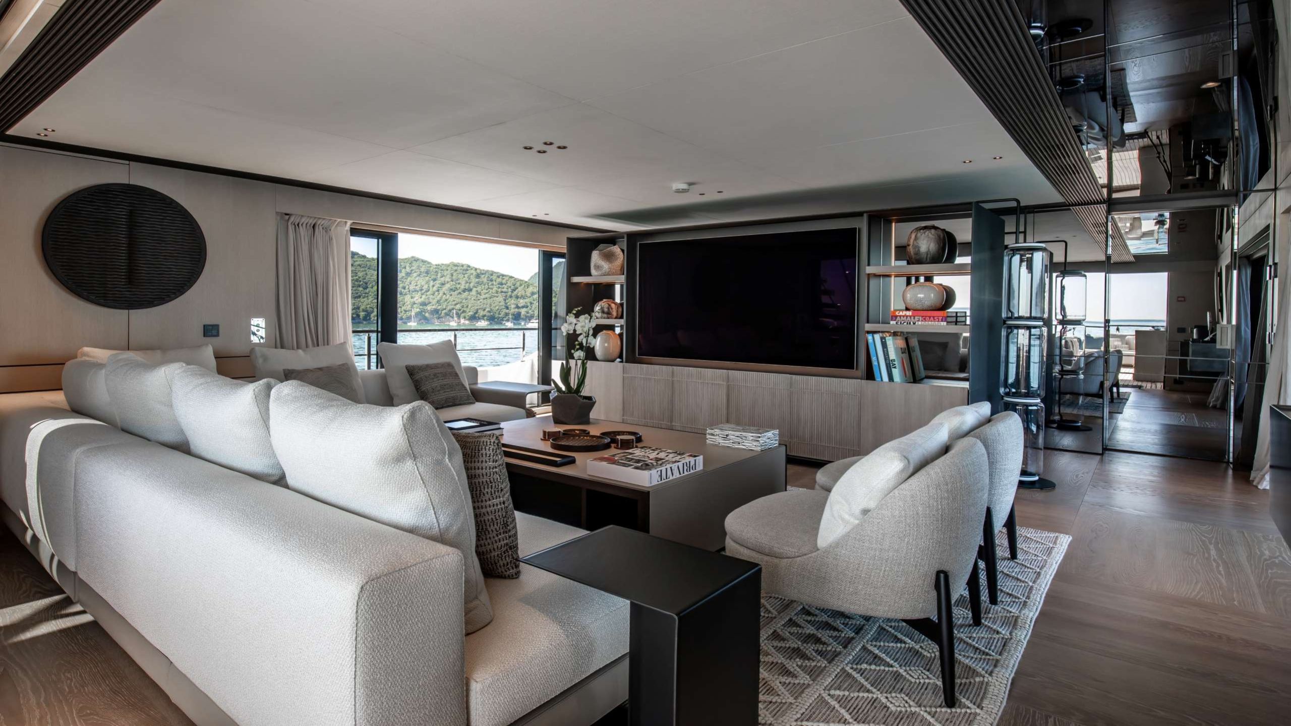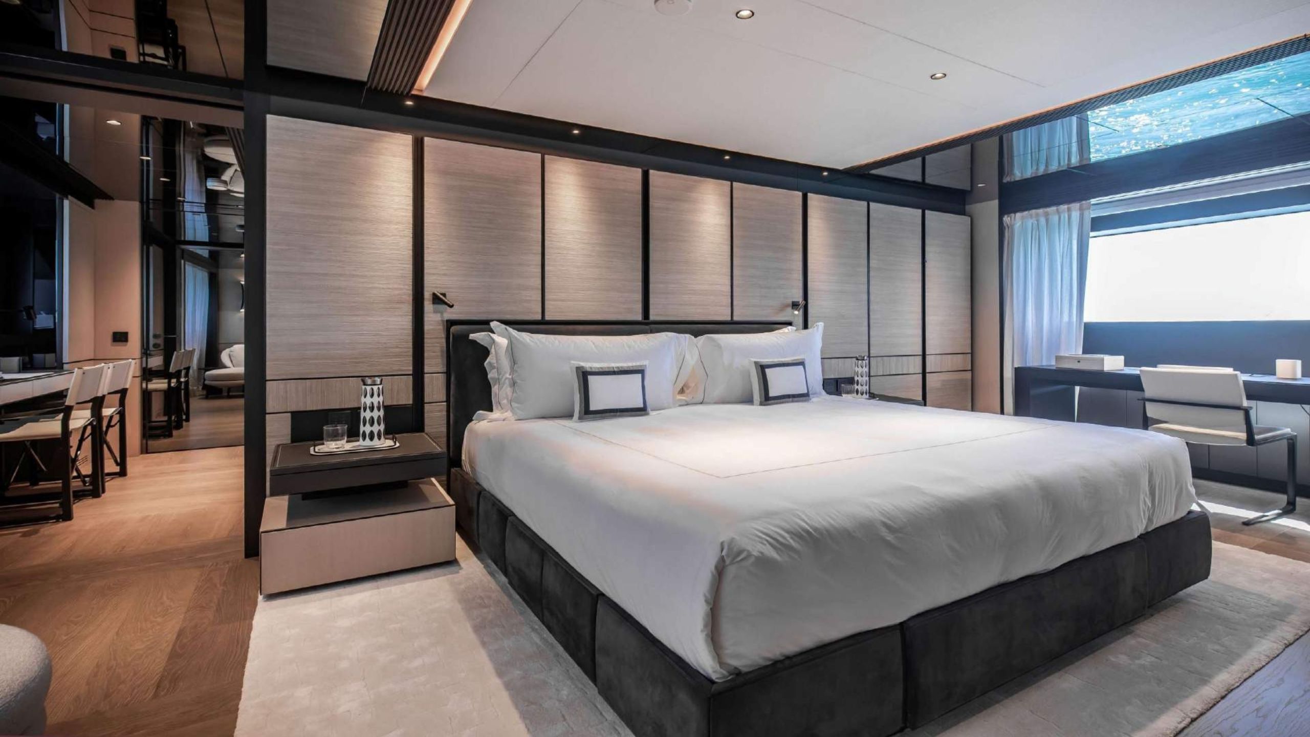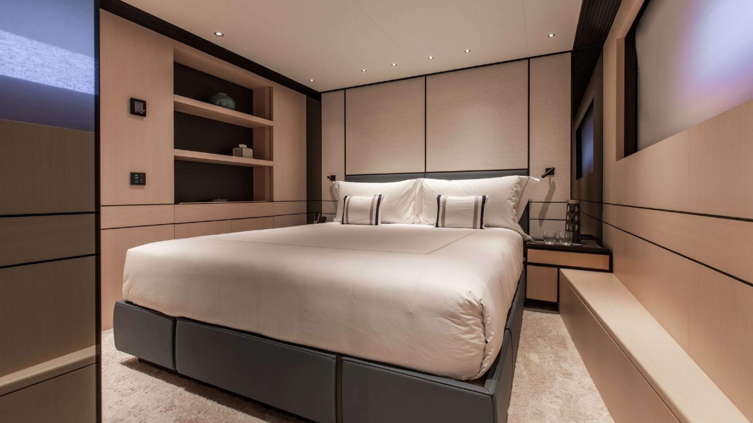 Il tema guida del design degli interni è la ricerca di ordine e armonia, realizzata attraverso una forte enfasi sulla precisione geometrica dei pannelli e dei dettagli. Lo stile è eclettico, mescolando ispirazioni contemporanee con influenze artistiche provenienti dall’Estremo Oriente. Molti elementi a bordo sono il risultato di una personalizzazione estrema, inclusi gli intrecci in pelle su misura, gli imponenti lavabi ricavati da singoli blocchi di marmo Lasa e la scala ospiti realizzata in travertino e pelle scamosciata—una caratteristica architettonica notevole che incarna eleganza e precisione. Una selezione meticolosamente curata di opere d’arte e pezzi decorativi completa l’esperienza a bordo, rendendo questo yacht un ambiente davvero eccezionale, caratterizzato da design raffinato e sofisticato.
