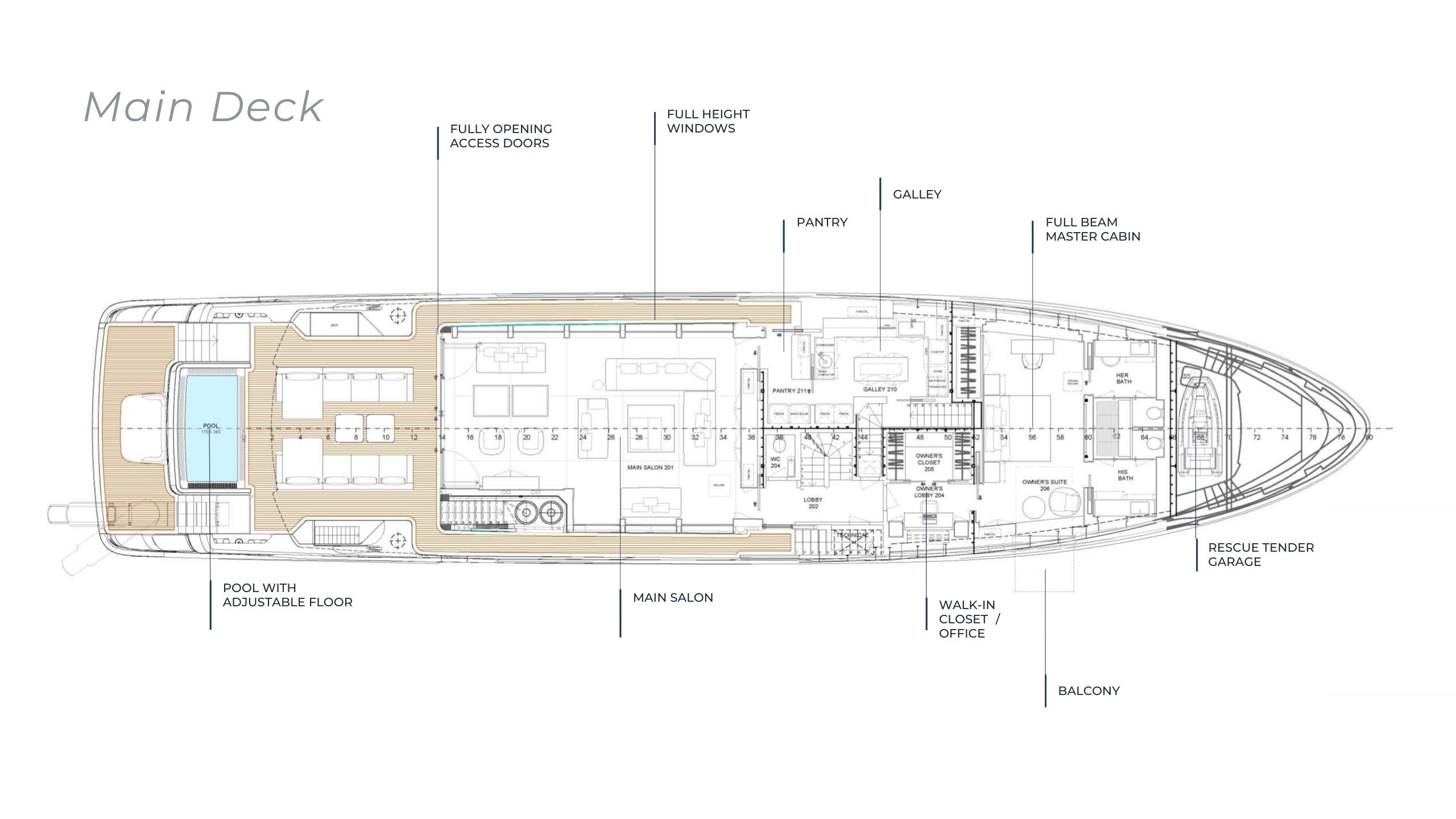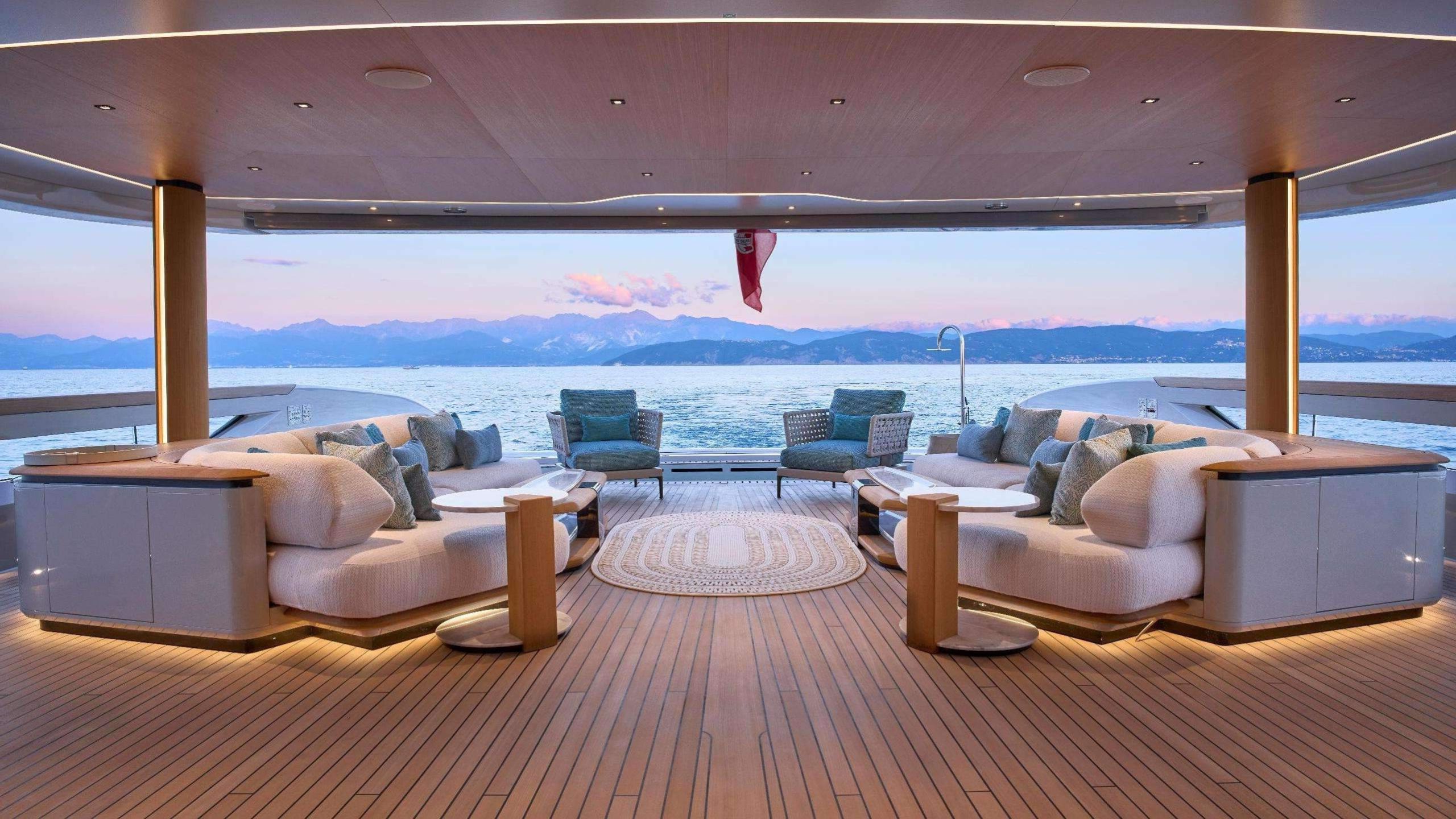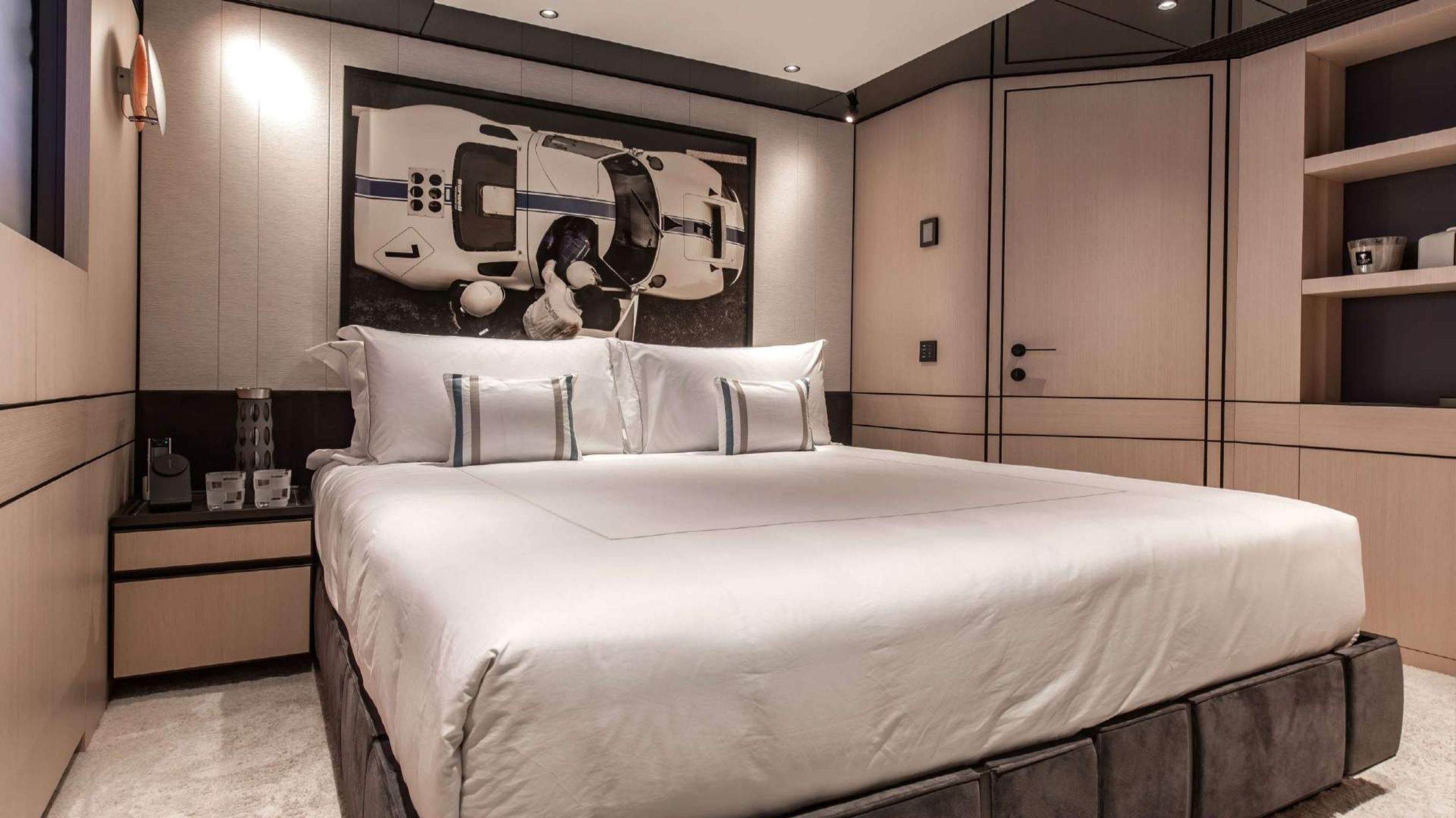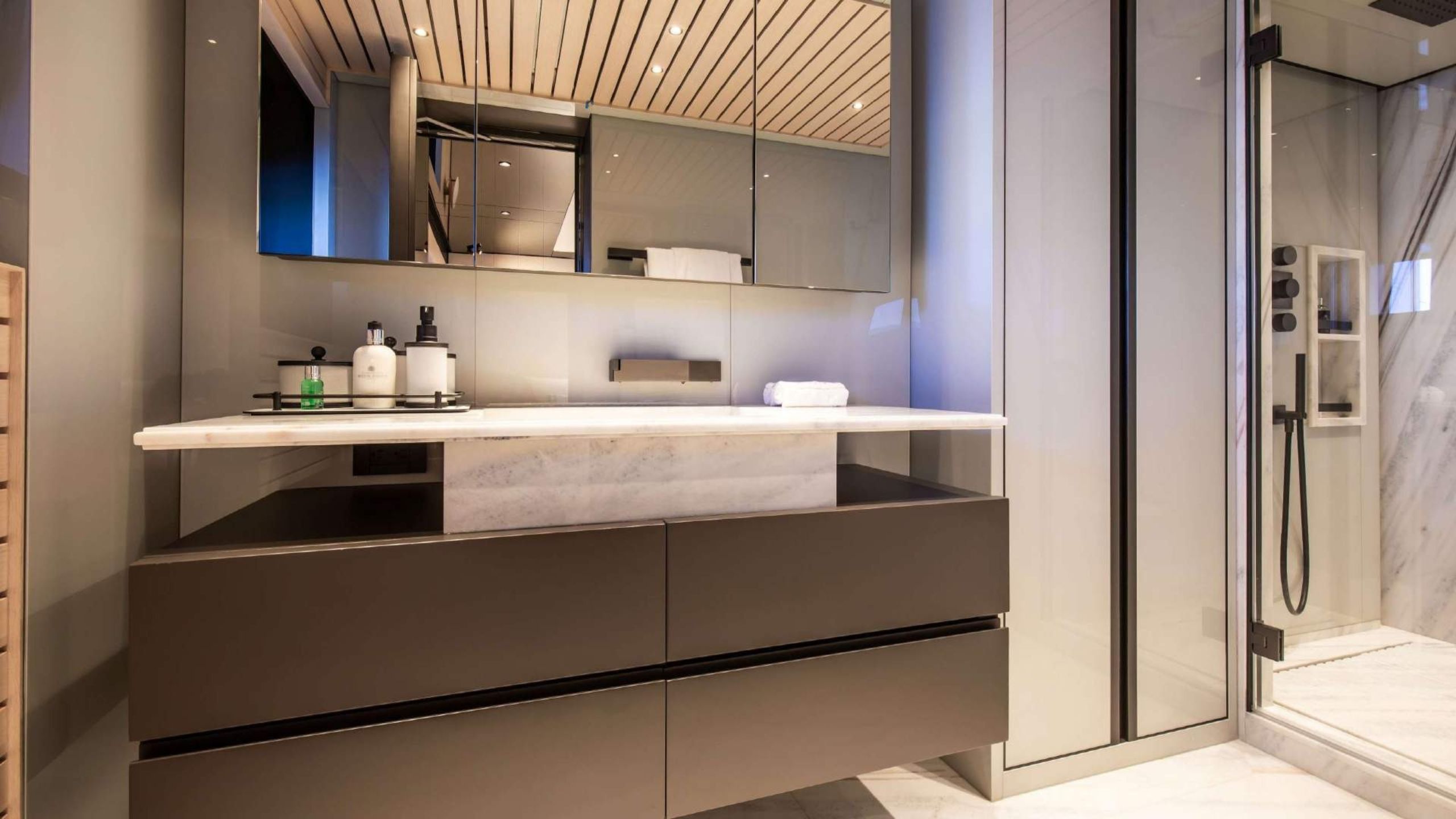 Il tema guida del design degli interni è la ricerca di ordine e armonia, realizzata attraverso una forte enfasi sulla precisione geometrica dei pannelli e dei dettagli. Lo stile è eclettico, mescolando ispirazioni contemporanee con influenze artistiche provenienti dall’Estremo Oriente. Molti elementi a bordo sono il risultato di una personalizzazione estrema, inclusi gli intrecci in pelle su misura, gli imponenti lavabi ricavati da singoli blocchi di marmo Lasa e la scala ospiti realizzata in travertino e pelle scamosciata—una caratteristica architettonica notevole che incarna eleganza e precisione. Una selezione meticolosamente curata di opere d’arte e pezzi decorativi completa l’esperienza a bordo, rendendo questo yacht un ambiente davvero eccezionale, caratterizzato da design raffinato e sofisticato.