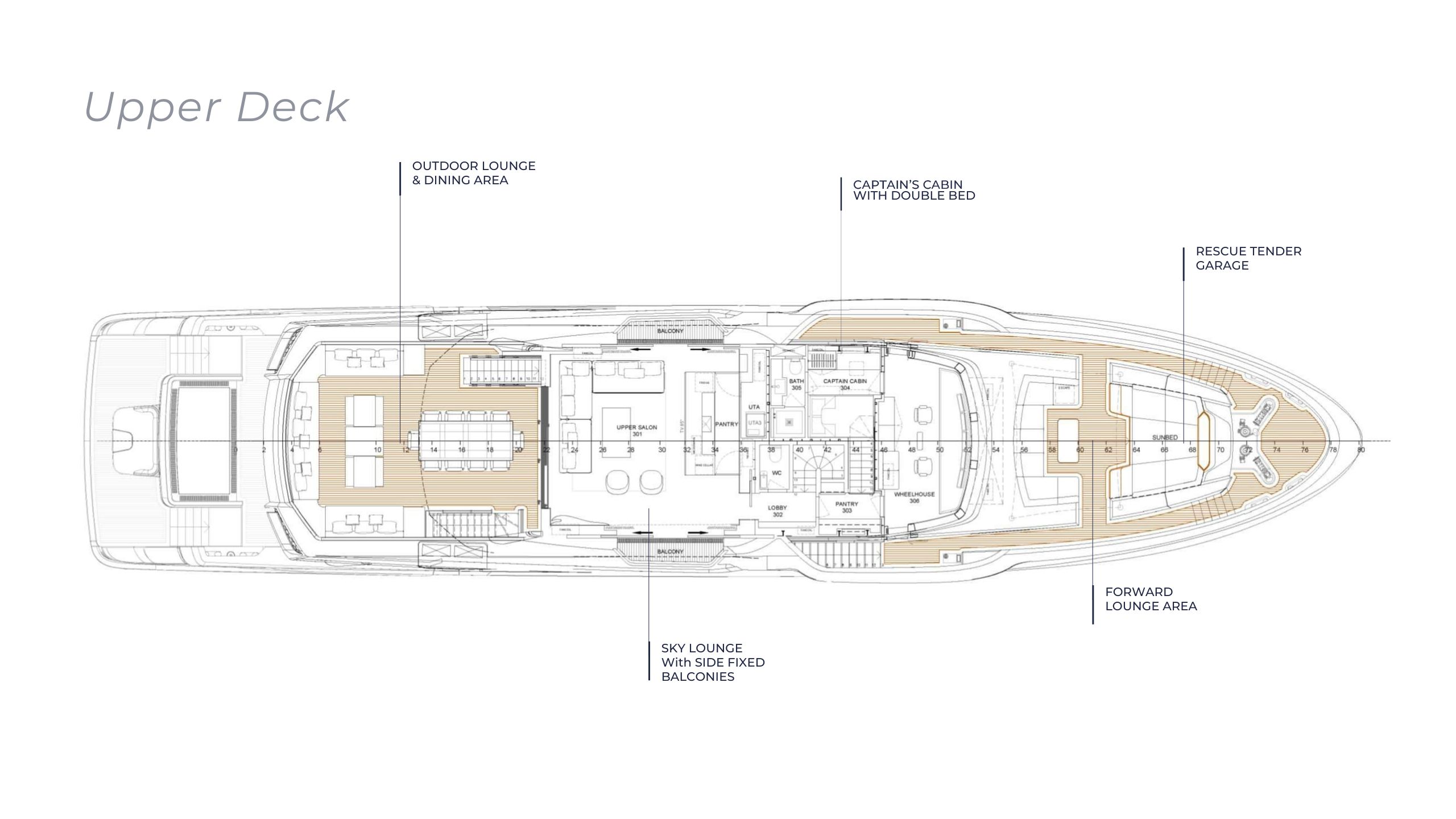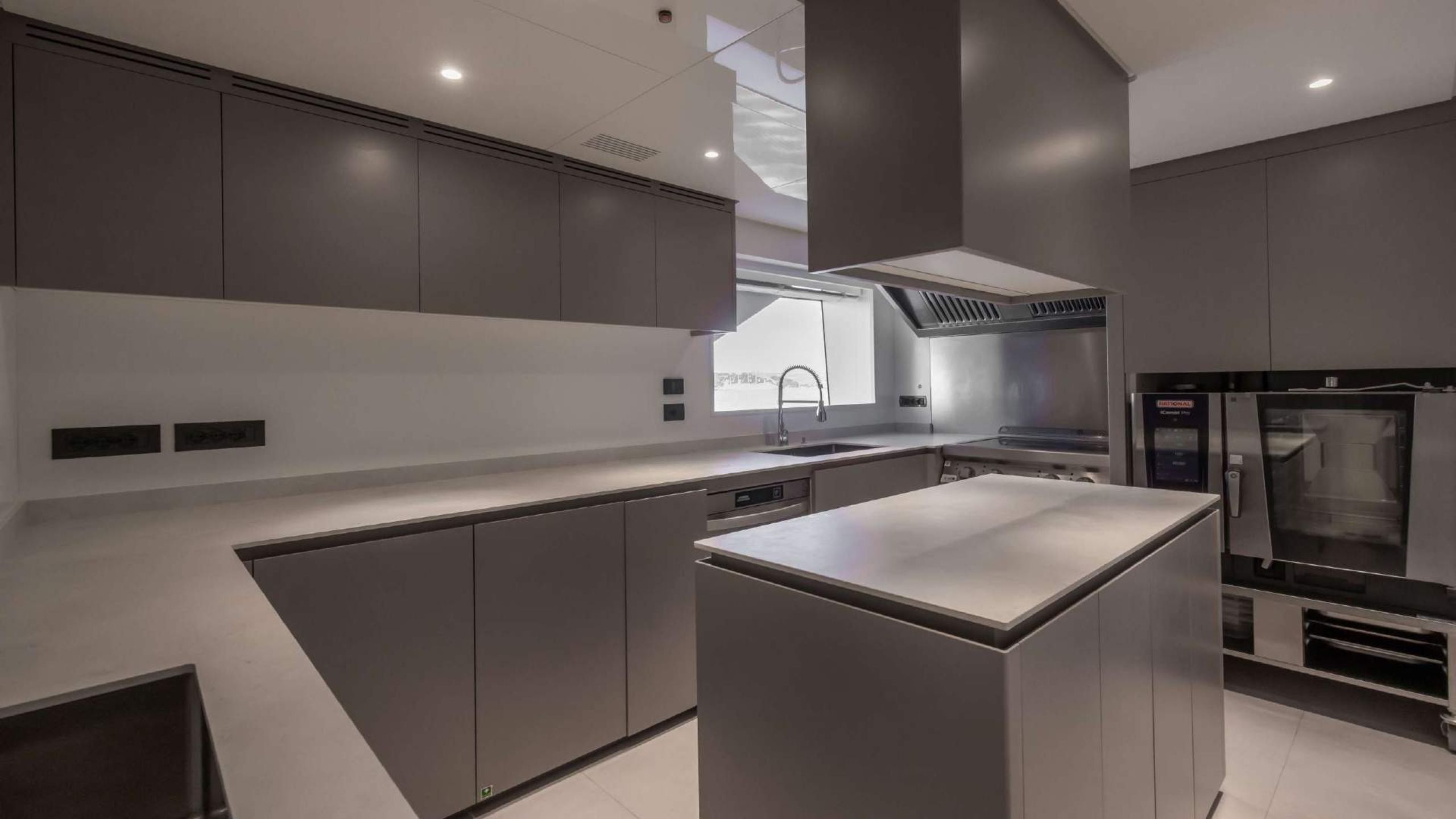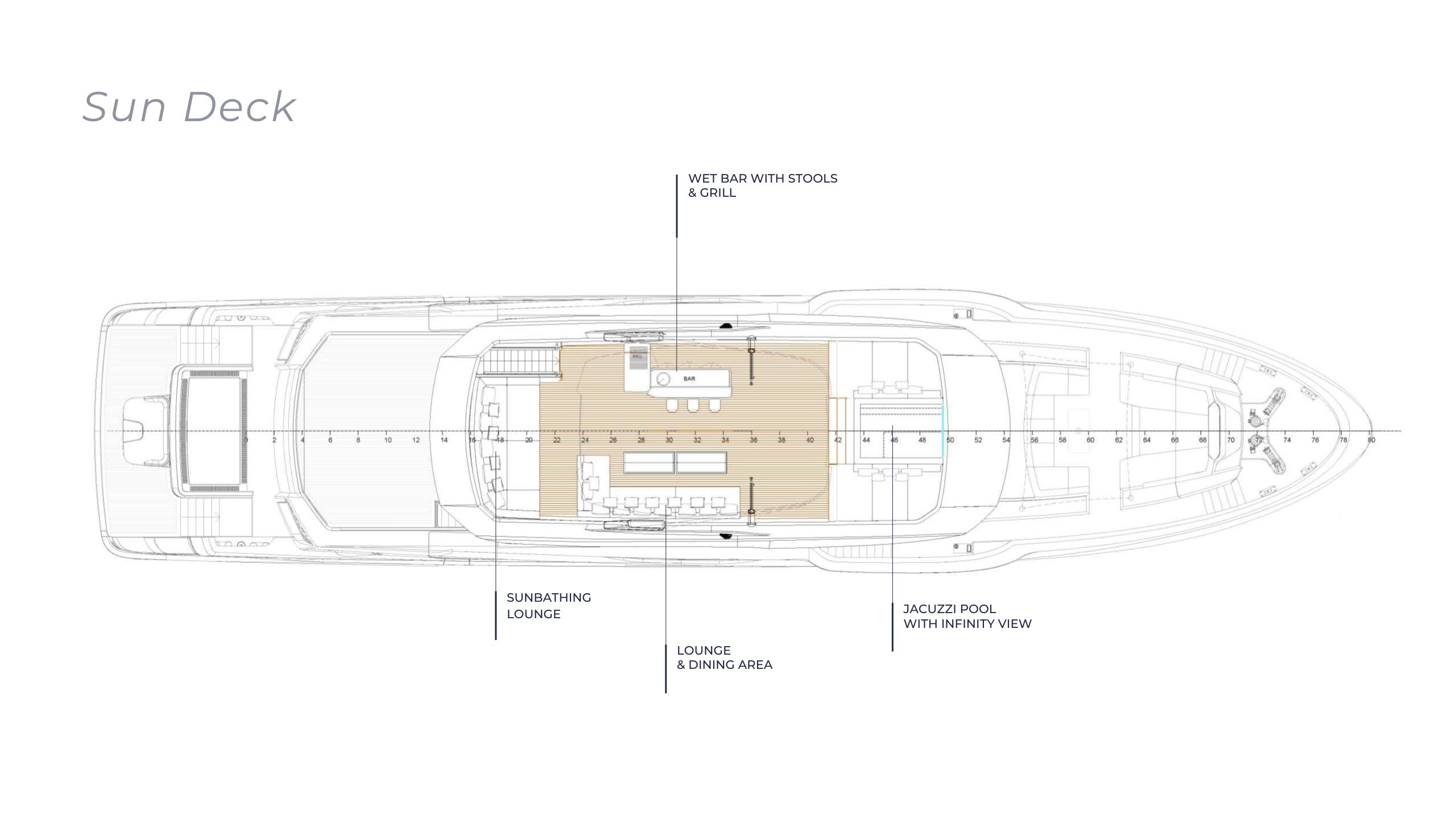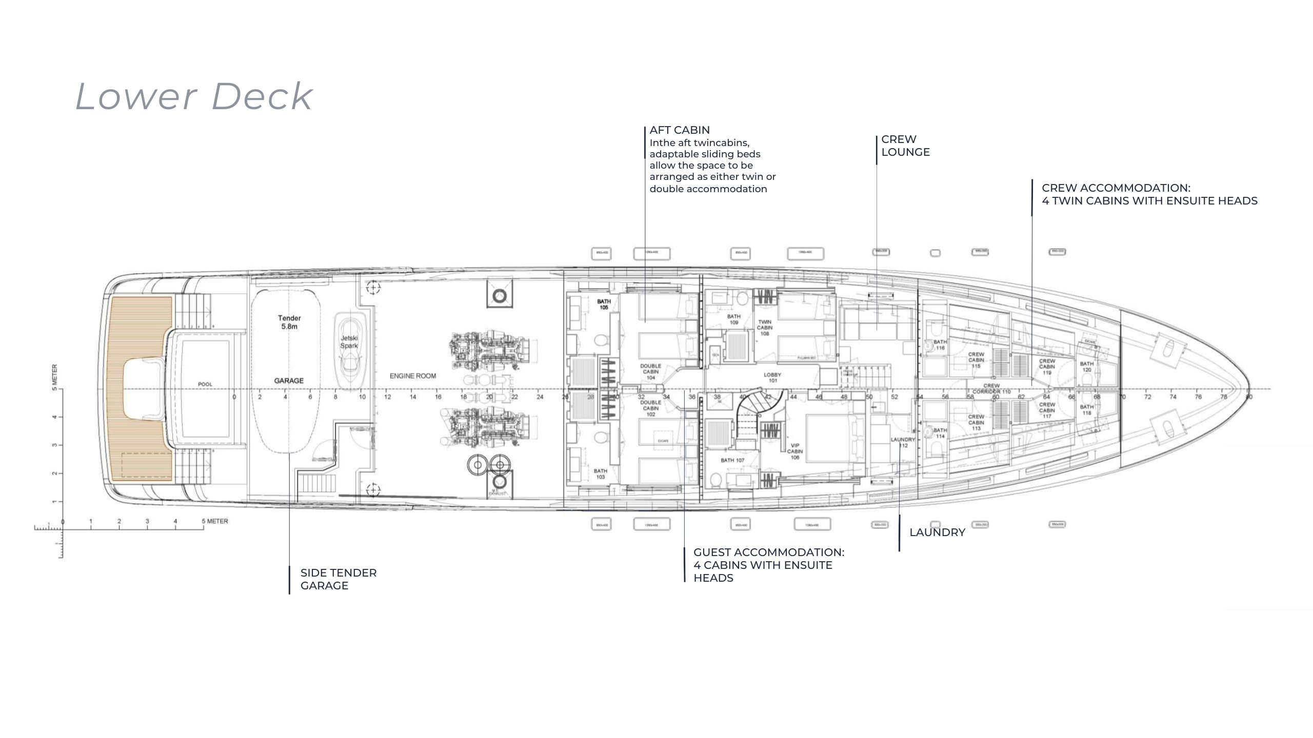 Il tema guida del design degli interni è la ricerca di ordine e armonia, realizzata attraverso una forte enfasi sulla precisione geometrica dei pannelli e dei dettagli. Lo stile è eclettico, mescolando ispirazioni contemporanee con influenze artistiche provenienti dall’Estremo Oriente. Molti elementi a bordo sono il risultato di una personalizzazione estrema, inclusi gli intrecci in pelle su misura, gli imponenti lavabi ricavati da singoli blocchi di marmo Lasa e la scala ospiti realizzata in travertino e pelle scamosciata—una caratteristica architettonica notevole che incarna eleganza e precisione. Una selezione meticolosamente curata di opere d’arte e pezzi decorativi completa l’esperienza a bordo, rendendo questo yacht un ambiente davvero eccezionale, caratterizzato da design raffinato e sofisticato.