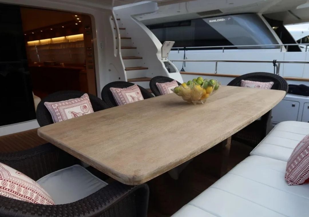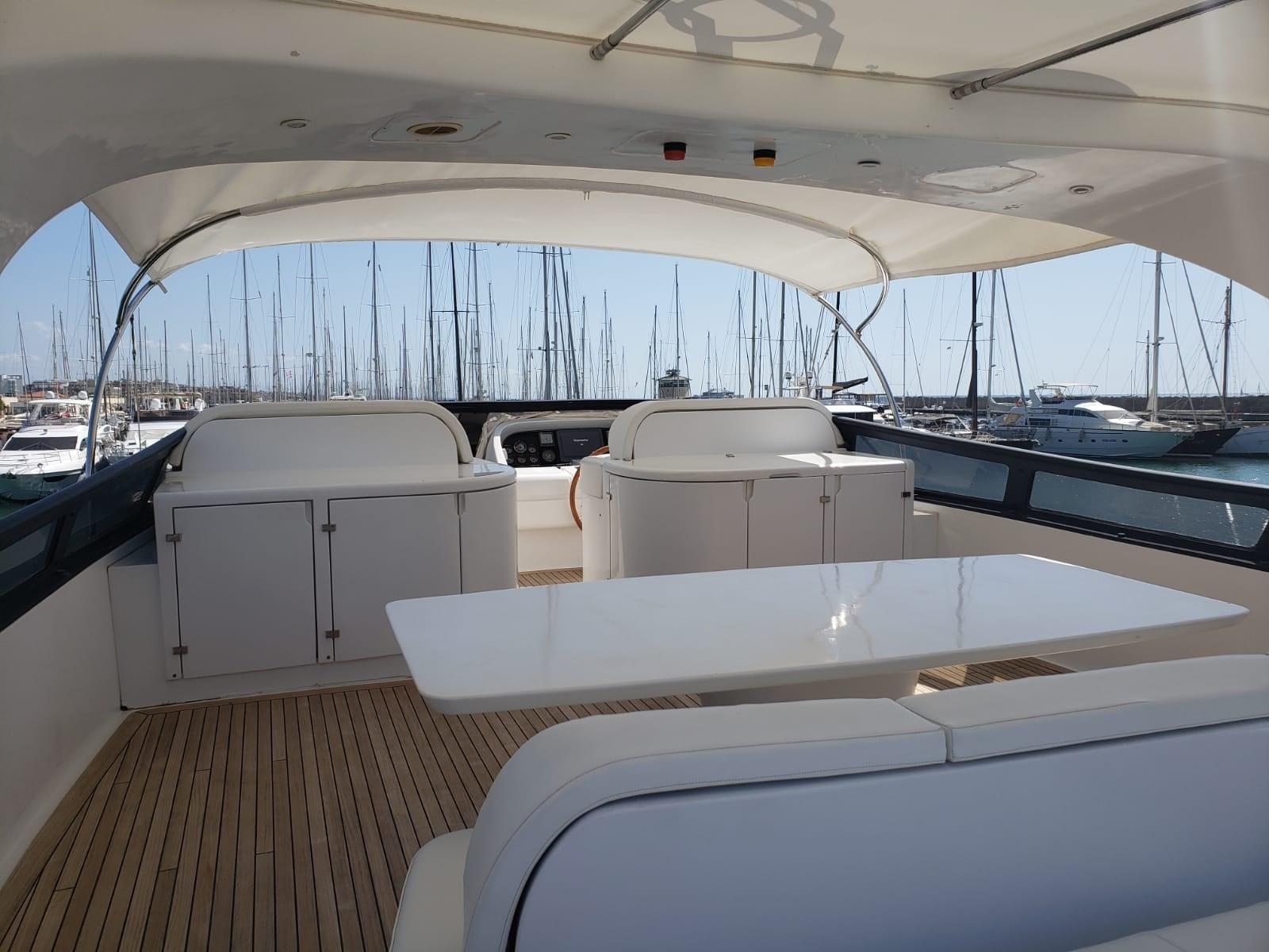Gli spazi esterni sono progettati per offrire il massimo del relax e della convivialità. Il pozzetto di poppa, accogliente e ben riparato, è perfetto per pranzi e aperitivi all’ombra, mentre sul flybridge un elegante tavolo da pranzo si affianca a una zona bar completamente attrezzata, ideale per intrattenere ospiti in totale libertà, mentre la disposizione degli arredi invita a godere del panorama in assoluto comfort.