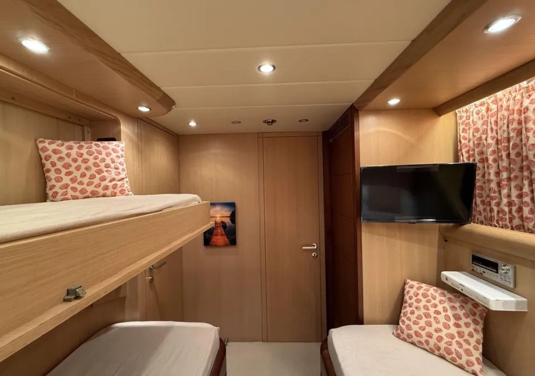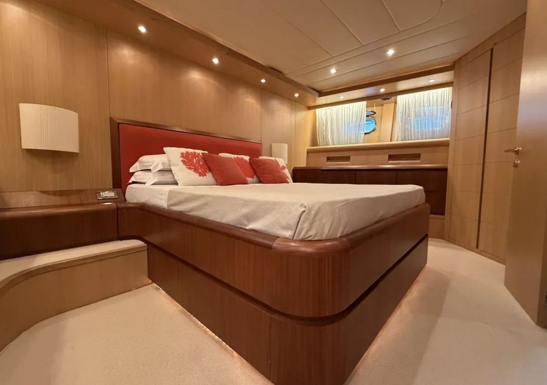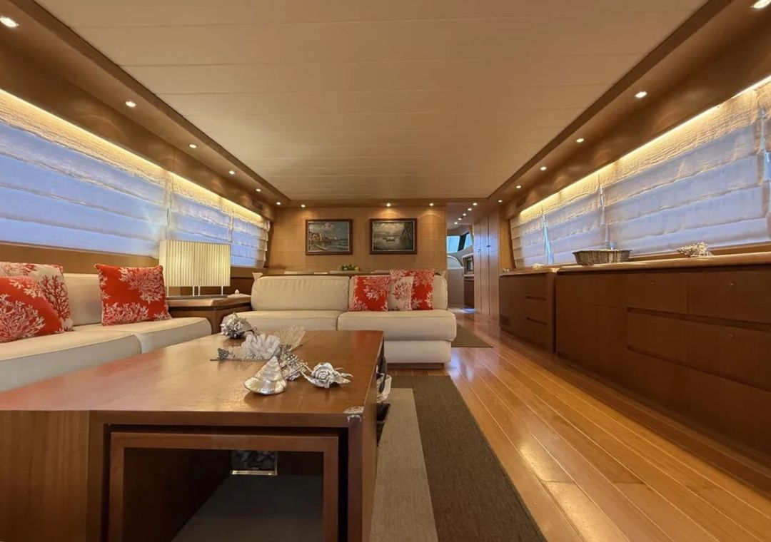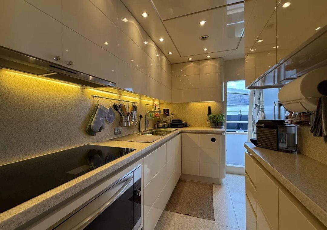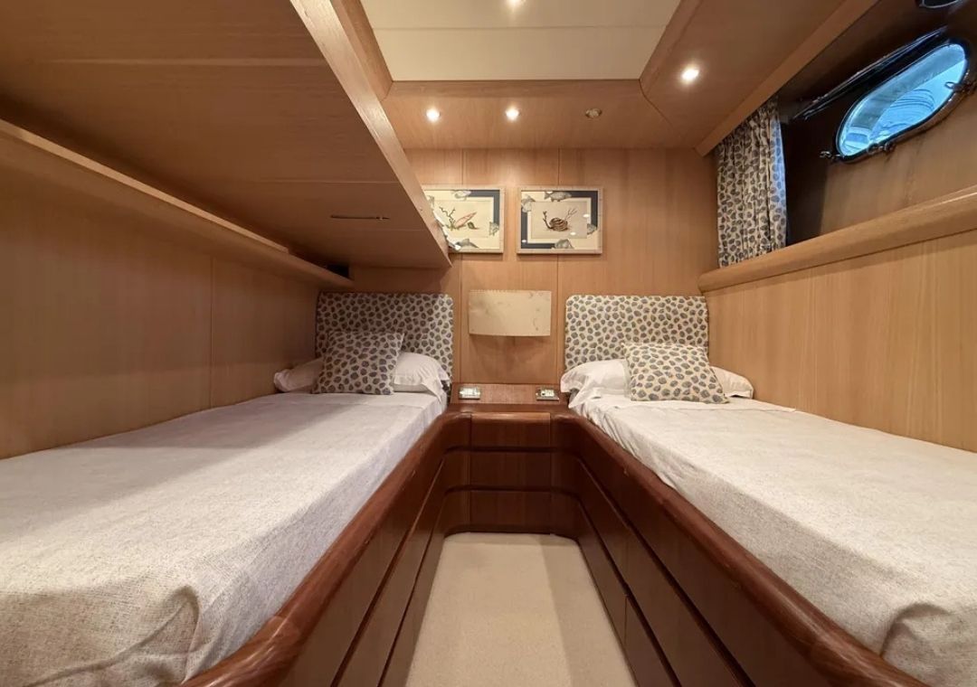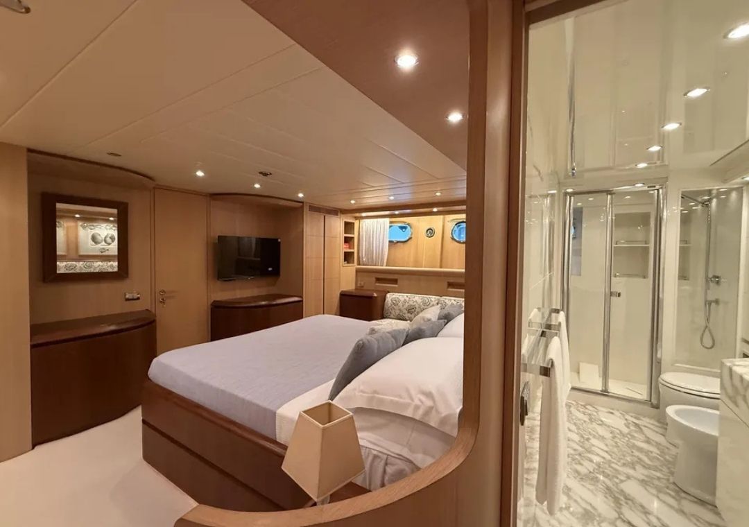 Il layout interno si sviluppa in ambienti ampi e ben distribuiti, offrendo quattro spaziose cabine ospiti con bagno en-suite e due cabine equipaggio indipendenti. Ogni spazio è climatizzato e rifinito con materiali selezionati, valorizzato da dettagli di pregio come le tende oscuranti, la cuscineria completa, il sistema audio Bose e le Smart TV presenti in tutte le cabine. La cucina, perfettamente equipaggiata con elettrodomestici Siemens e Liebherr, è pensata per un utilizzo funzionale e raffinato.