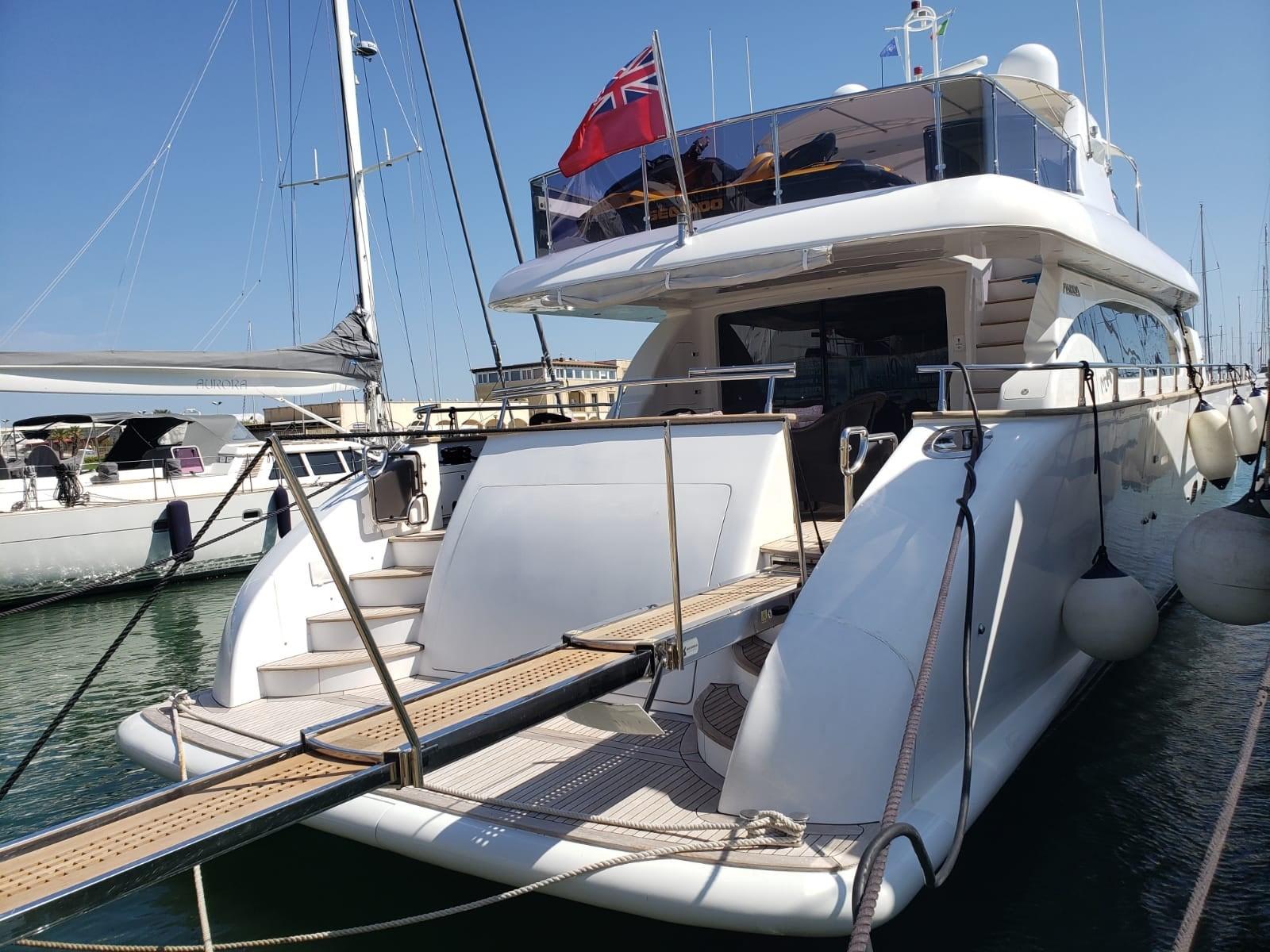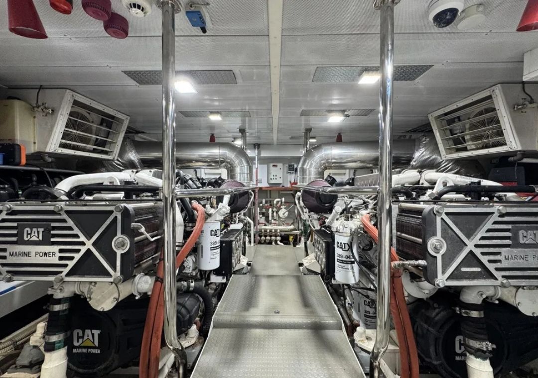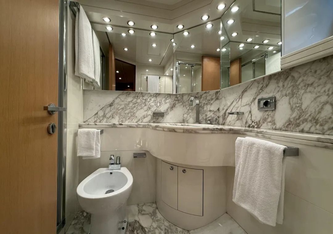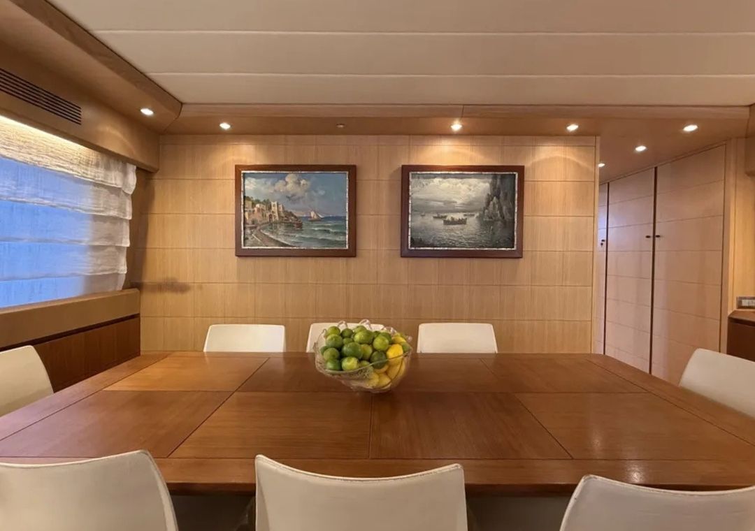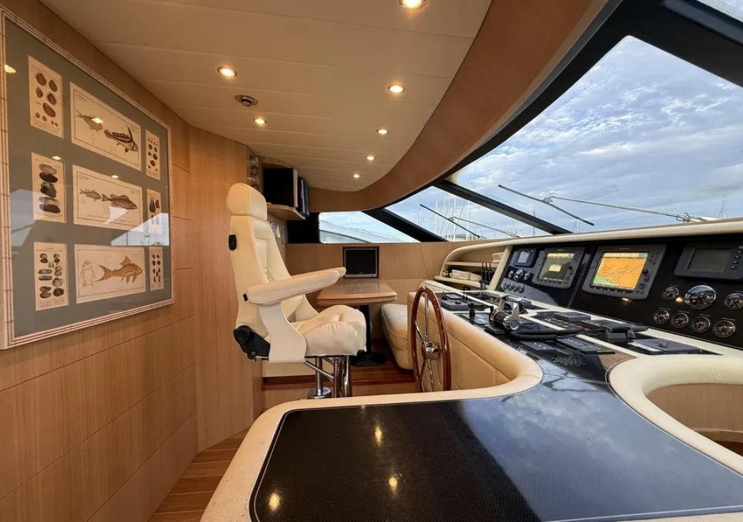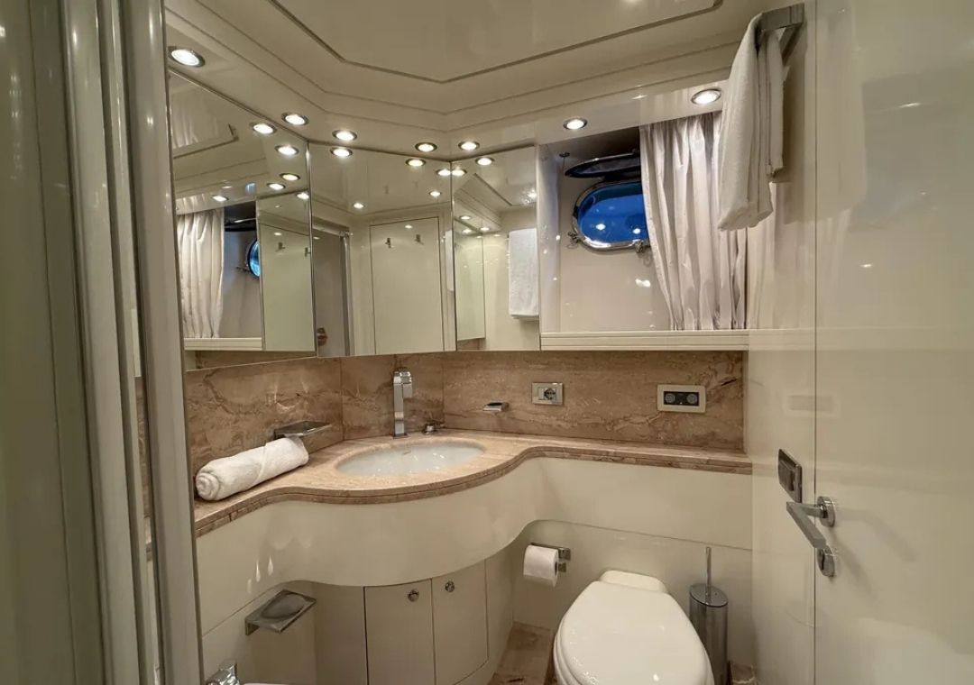 Il layout interno si sviluppa in ambienti ampi e ben distribuiti, offrendo quattro spaziose cabine ospiti con bagno en-suite e due cabine equipaggio indipendenti. Ogni spazio è climatizzato e rifinito con materiali selezionati, valorizzato da dettagli di pregio come le tende oscuranti, la cuscineria completa, il sistema audio Bose e le Smart TV presenti in tutte le cabine. La cucina, perfettamente equipaggiata con elettrodomestici Siemens e Liebherr, è pensata per un utilizzo funzionale e raffinato.