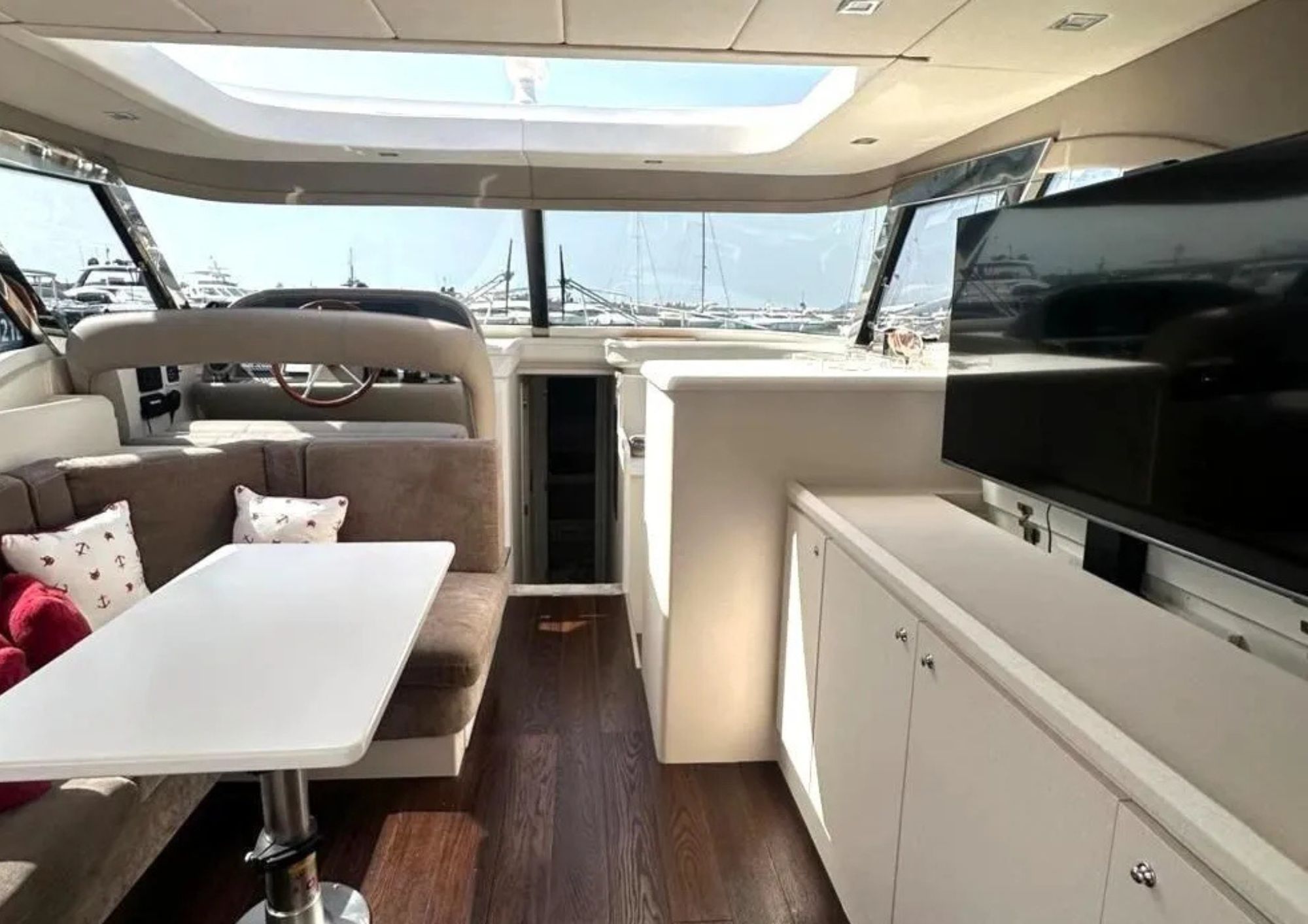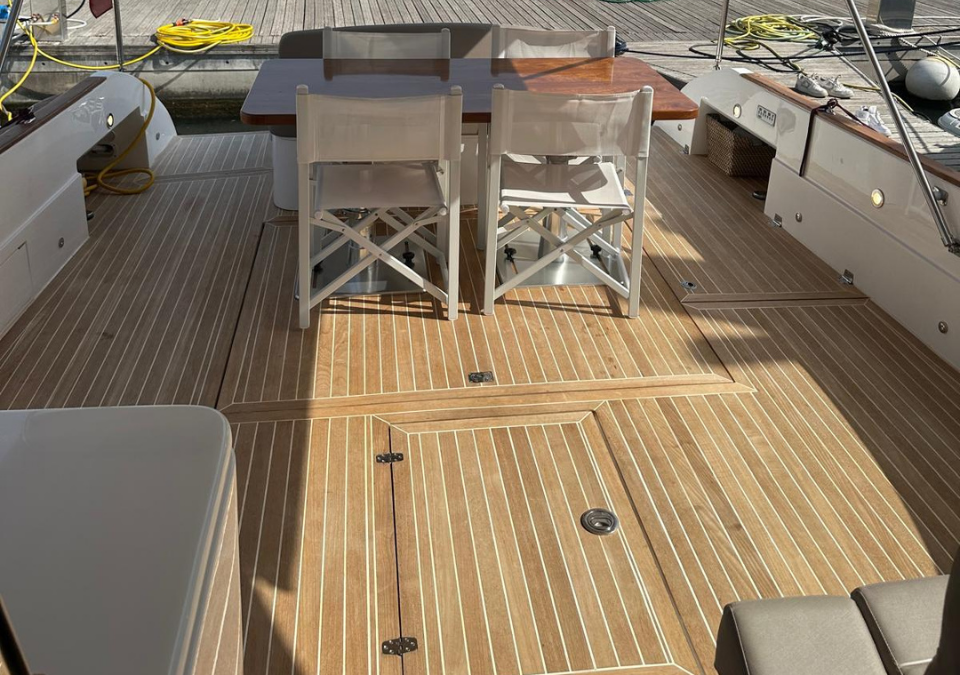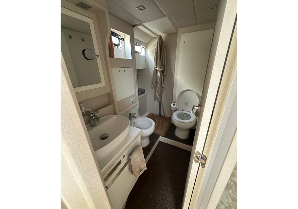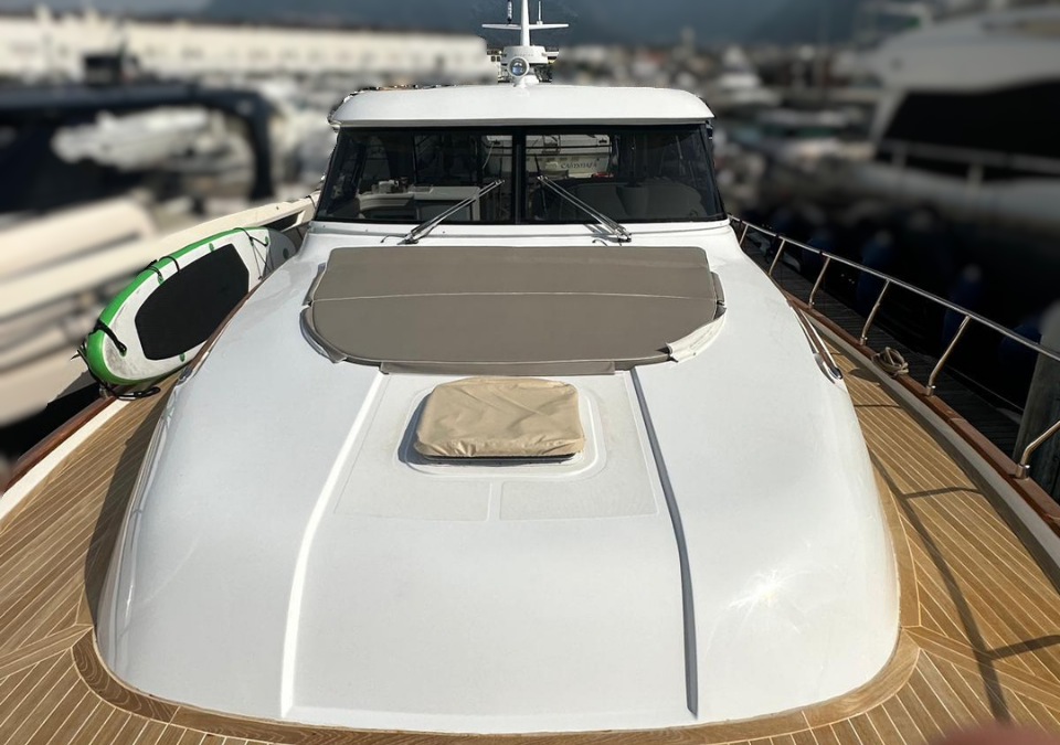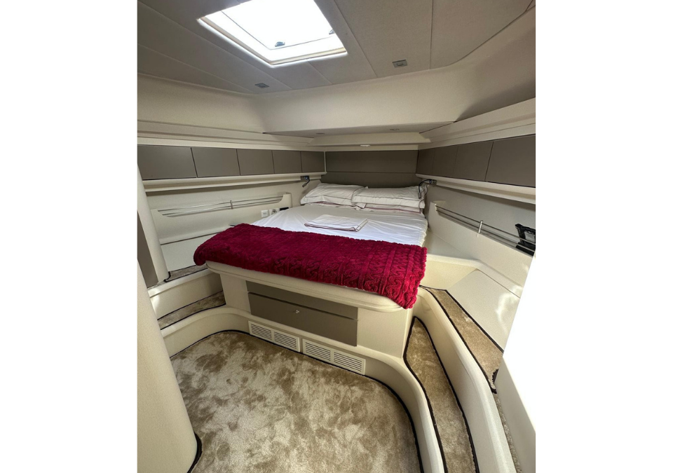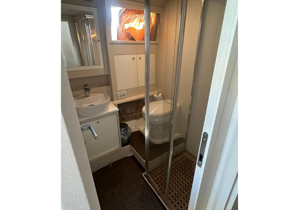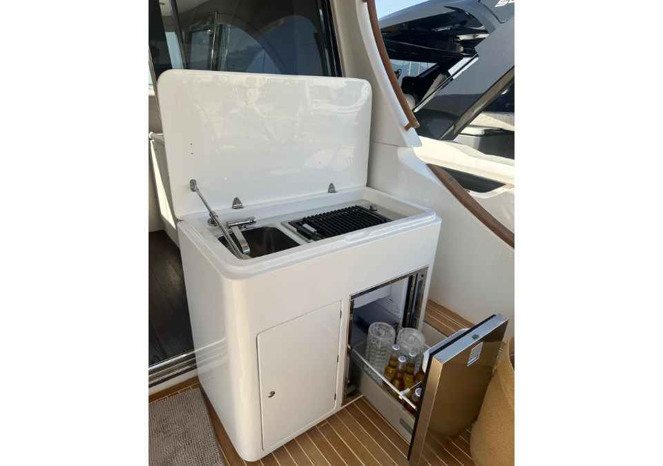 LAYOUT: Saloon with large “C”-shaped sofa with central table, storage unit with foldaway TV; kitchenette equipped with double-bowl stainless steel sink, four-burner induction stove, electric oven, and refrigerator. Steering console with fully equipped dashboard and new instrumentation. Master cabin with double bed and bathroom with separate shower; guest cabin with twin beds; Guest bathroom with separate shower. Large cockpit with comfortable sofa and six-seater table. Cabinet with barbecue grill and refrigerator. Access to the crew cabin, equipped with a bathroom.