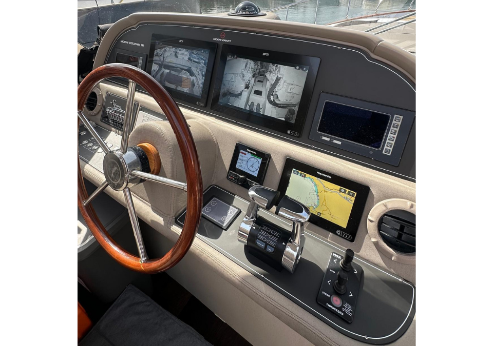 In excellent overall condition, this charming 2006 Dolphin 51, built by the Mochi Craft shipyard, has undergone a major refit over the years. It has also received regular routine and extraordinary maintenance by specialized personnel. Completely refitted, the extensive extraordinary maintenance work includes the complete reupholstery of all interior furnishings, the complete replacement of all upholstery and exterior cushions, the overhaul of the air conditioning, electrical, and plumbing systems, the replacement of steering instruments, the replacement of exterior teak, a complete overhaul of both propulsion engines (zero-hours), and the complete restoration of the engine room.