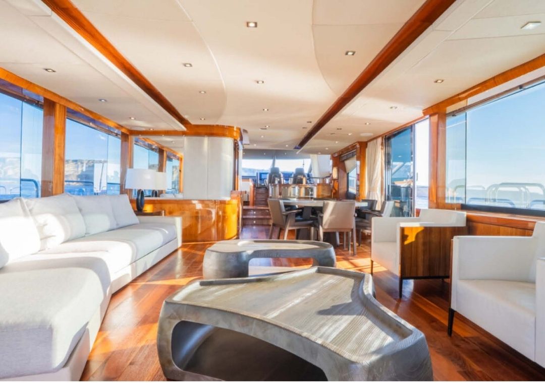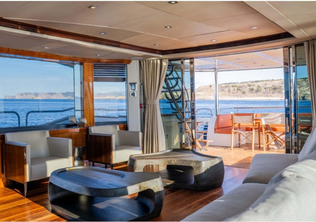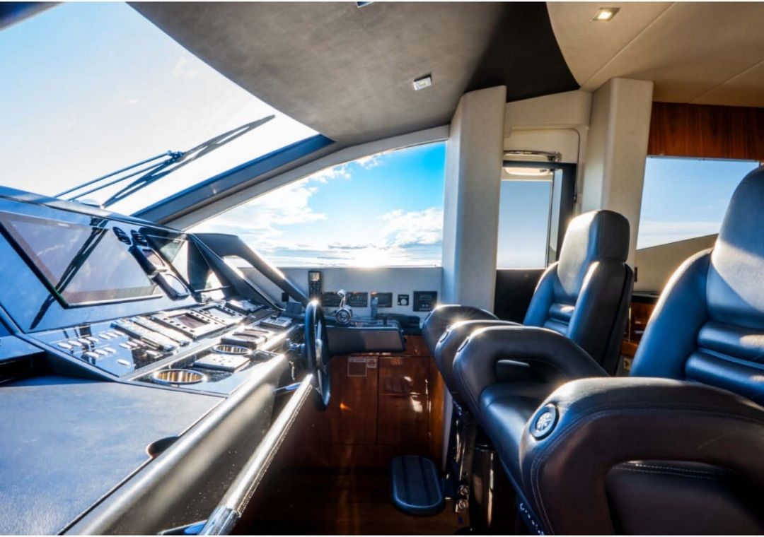 A 2015 Sunseeker 92, motor yacht defined by sleek lines and expansive panoramic windows that create a bright, elegant, and inviting interior.